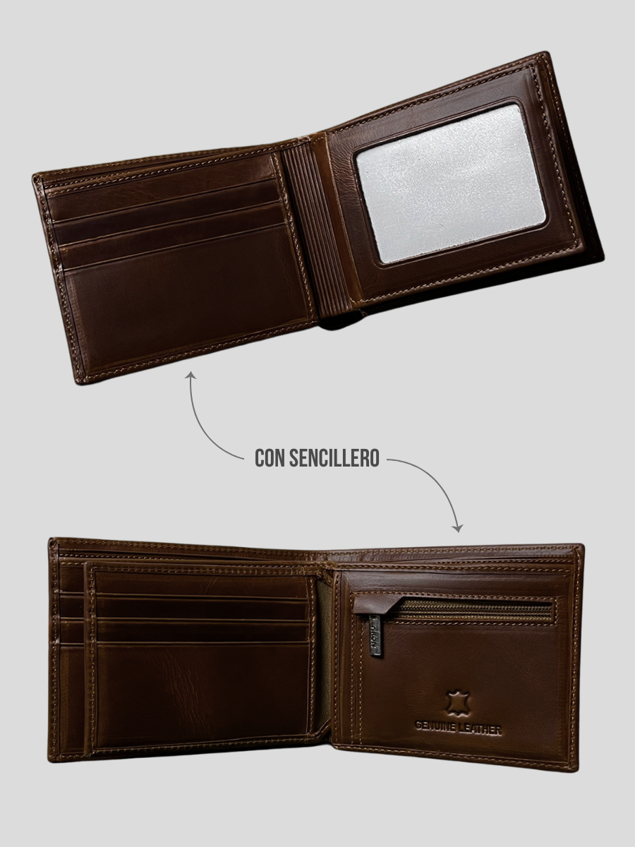 Elegancia en su máxima expresión. Billetera en cuero vacuno premium, con una textura natural que realza su autenticidad. Forro de poliéster, espacio para tarjetas, billetes y sencillera, y accesorios metálicos en acabado níquel para un toque sofisticado y duradero.