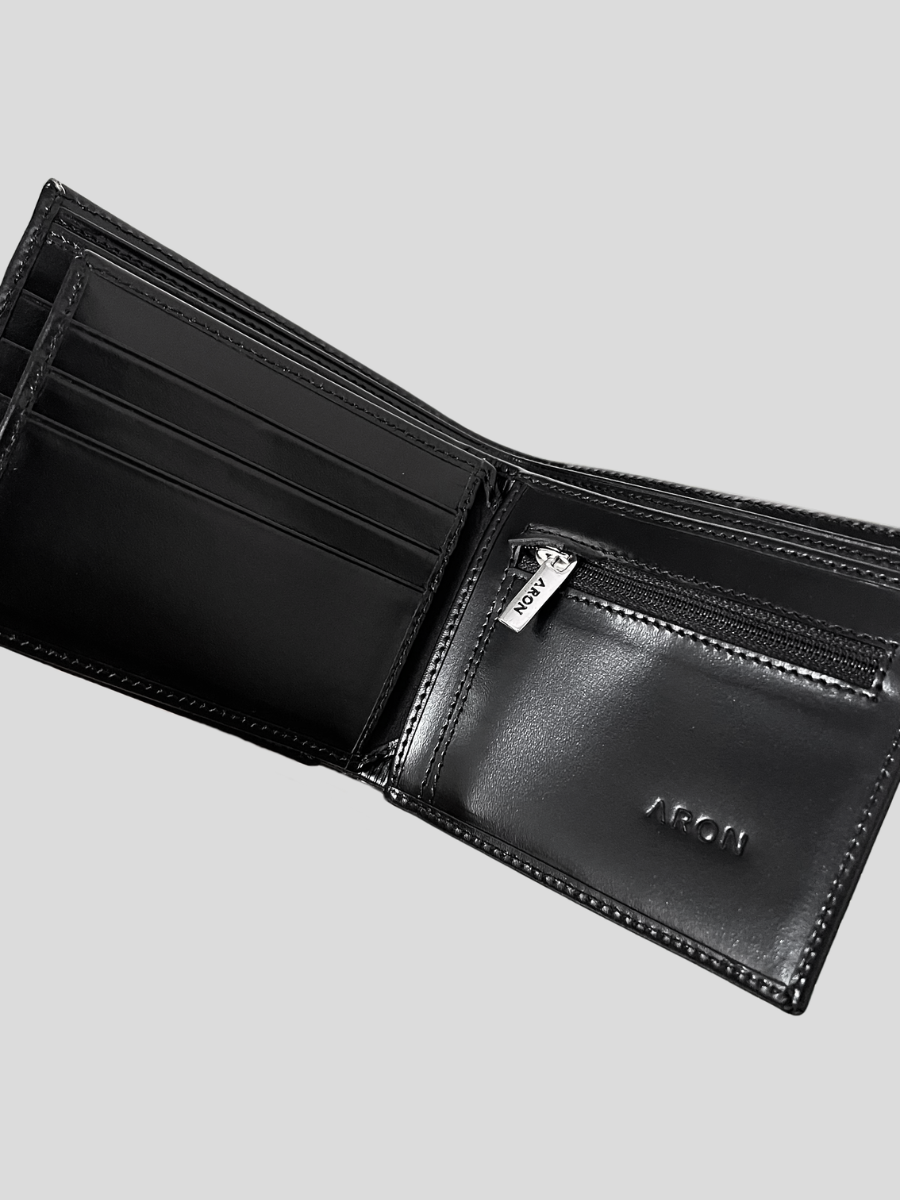 Elegancia en su máxima expresión. Billetera en cuero vacuno premium, con una textura natural que realza su autenticidad. Forro de poliéster, espacio para tarjetas, billetes y sencillera, y accesorios metálicos en acabado níquel para un toque sofisticado y duradero.