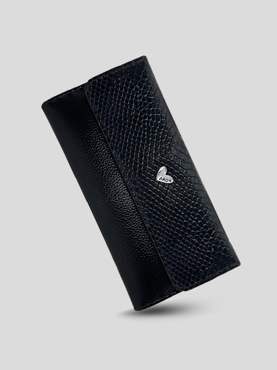 Combina la elegancia atemporal de un sobre con la resistencia del cuero vacuno 100% genuino. Su diseño con textura tipo reptil y su interior organizado con múltiples compartimentos la convierten en la aliada perfecta para llevar tarjetas, billetes y documentos con total estilo y seguridad. Un accesorio que realza cualquier look con distinción y practicidad.