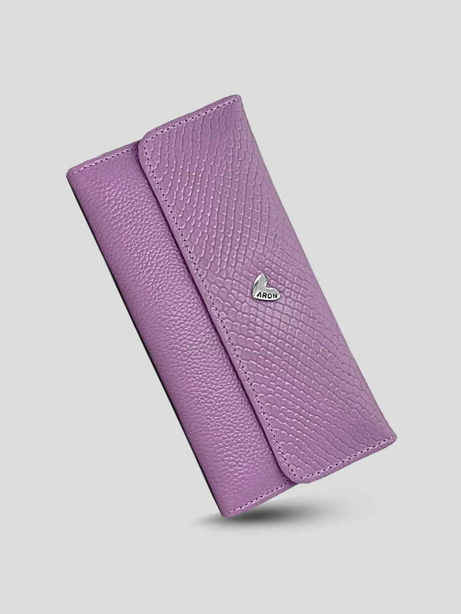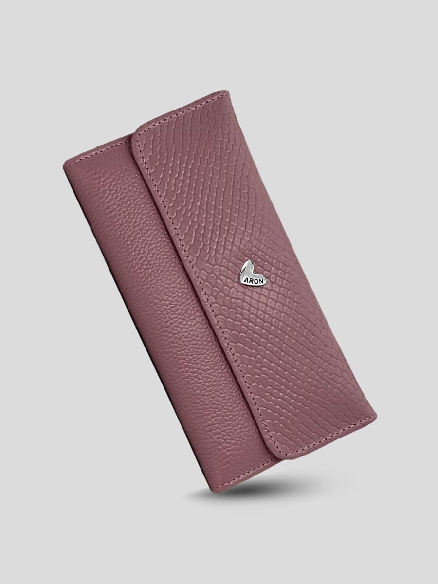 Su tono rosa malva, moderno y versátil, se combina con la textura tipo reptil en cuero vacuno 100% genuino para crear un accesorio sofisticado y funcional. Con compartimentos amplios para organizar tarjetas, billetes y documentos, es el equilibrio ideal entre estilo y practicidad para el día a día.
